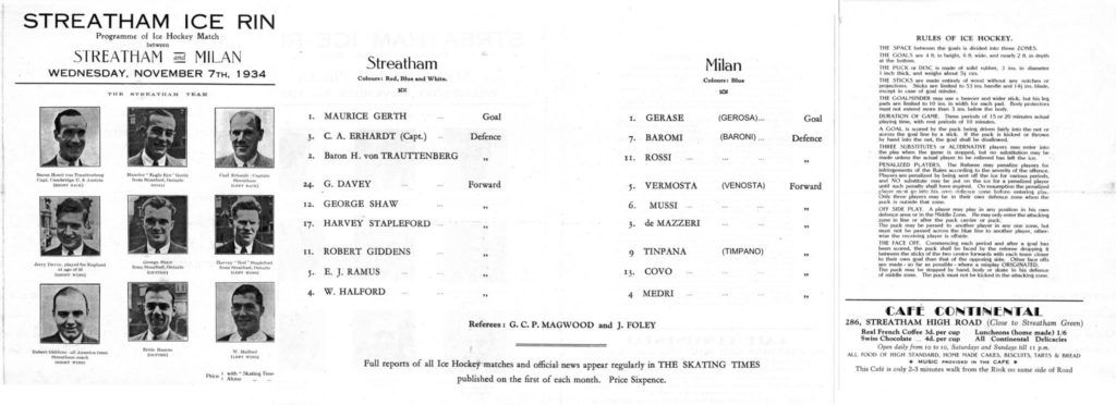 Il procedere del torneo prevede per il Milano le lunghe trasferte di Londra e Parigi. Dapprima si raggiunge l’Inghilterra dove il 7 e 8 novembre i neri vengono sconfitti da Streatham e Wembley Lions. Nelle due gare questa la formazione schierata: Gerosa; Baroni, Franco Rossi; De Mazzeri, Mussi, Venosta; Timpano, Medri, Signorini. Quest’ultimo, cresciuto hockeisticamente nelle file dei cugini dell’Excelsior e passato al Milano tre stagioni prima, ha sostituito lo sfortunato Pietro Covo che si è procurato una lussazione alla spalla nel corso di una partita amichevole. Con lo Streatham, quattro canadesi e due nazionali, la sconfitta è netta (9-0) e alla superiorità degli avversari si aggiunge la fatica accumulata durante il lungo e interminabile viaggio.