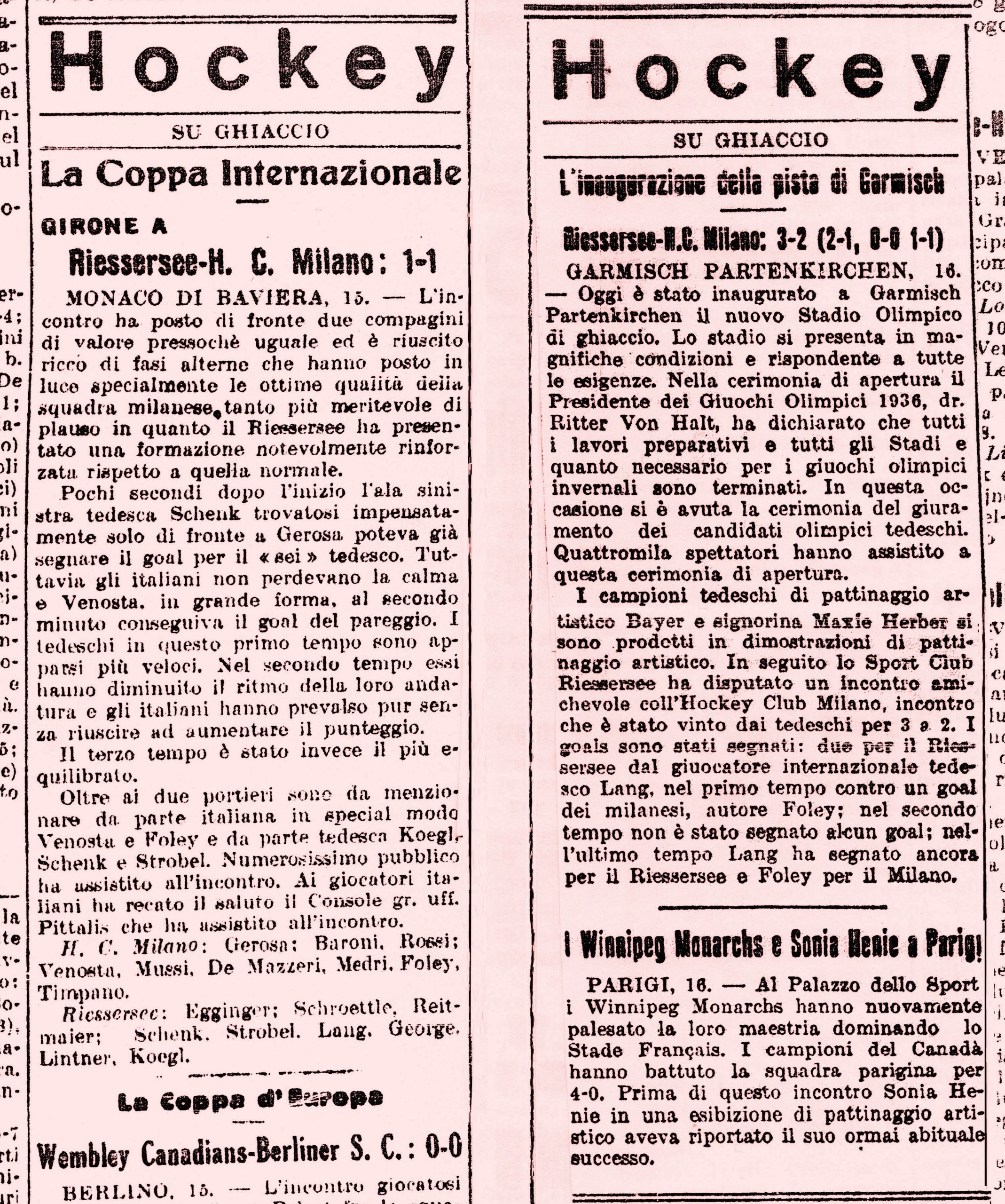 Una settimana dopo, per l’ultima trasferta europea, i milanesi si spostano in Germania per il retour-match con il Riessersee. In Baviera il Milano gioca due partite; la prima sabato 15 dicembre a Monaco e la seconda il giorno seguente a Garmisch-Partenkirchen. La stampa internazionale, a eccezione del “Wiener Sport-tagblatt” prende un’enorme cantonata e da valida per la Coppa Europa la gara di Garmisch, mentre non menziona il match di sabato che era quello valevole per la competizione in questione. Come il quotidiano sportivo viennese anche “La Gazzetta dello Sport” segnala esattamente la funzione delle due gare: a Monaco per la coppa e a Ga-Pa per l’inaugurazione della patinoire olimpica. Anche nella partita di Monaco il Riessersee ha schierato giocatori del Füssen EV, nonché Werner George (Brandenburg Berlin) che pare abbia disputato qualche incontro del girone B indossando la maglia del Berlino SC!
