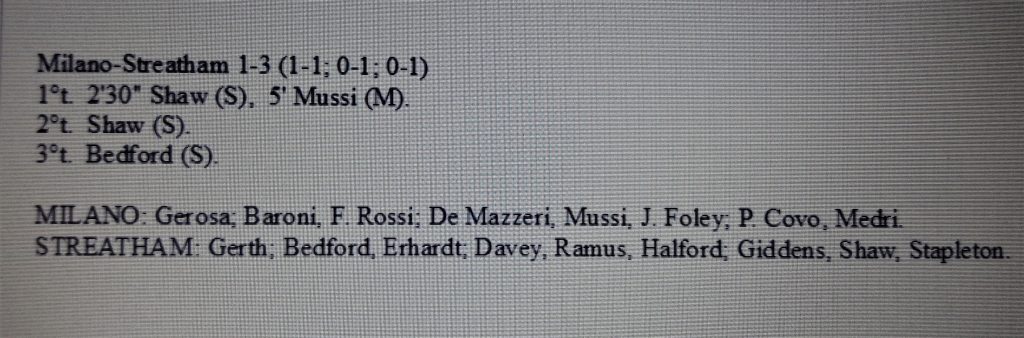L’ultima partita di Coppa il Milano la gioca in gennaio e lo Streatham alla caccia di punti per accedere al girone finale passa al Piranesi per 3-1. Il Milano è privo di Gigi Venosta e Giuseppe Timpano e iscrive a referto Pietro Covo e Piero Fabris, ma il primo si dovrà accontentare di qualche cambio e il secondo dei gemelli Fabris rimarrà in panchina per tutto il match. Il Milano chiuse la classifica del girone con soli due punti, ottenuti nelle gare disputate con il Riessersee, l’unica rivale abbordabile del raggruppamento per di più notevolmente rinforzata da giocatori tedeschi di altre squadre. Le formazioni londinesi e lo Stade erano di un livello troppo alto e si deve tenere conto che da due anni la rosa dei neri veniva regolarmente “saccheggiata” dai neonati cugini rossoneri; l’anno successivo tesserarono anche Augusto Gerosa, in quegli anni ritenuto uno dei migliori portieri europei.