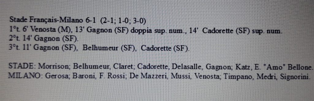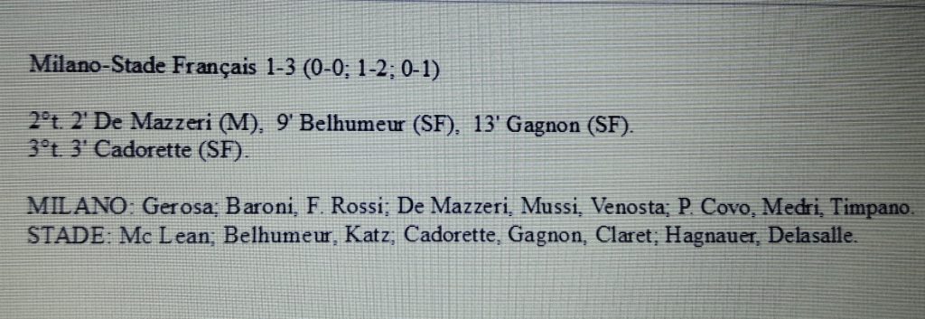 Senza sosta, treno, nave, treno e si è già a Parigi. Sabato 10 novembre gara di ritorno con lo Stade Français e altra netta sconfitta (6-1). Severo il giudizio dei quotidiani italiani: totale dominio stadista, un grande Gerosa evita un passivo ancora più pesante, Milano totalmente assente in attacco e solo tiri da lontano, ultimo a zero punti. Per “Il Corriere della Sera” alla partita hanno assistito almeno 10.000 spettatori! Con lo Stade ha esordito Emilio “Amo” Bessone, fratello del più note Pete sempre assente per infortunio. Dal minutaggio delle marcature si nota che il sorpasso effettuato dai parigini negli ultimi minuti del primo periodo è stato agevolato dalle superiorità numeriche e che tutte le altre reti sono state realizzate sul finire delle frazioni di gioco, a rimarcare un evidente calo fisico da parte milanese.