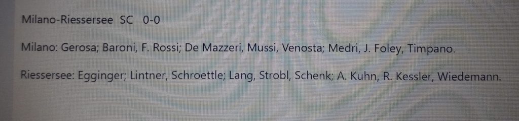 Il 21 novembre il Milano gioca la sua quinta partita e al Piranesi scende il Riessersee SC. Contro i tedeschi esordisce il nuovo allenatore-giocatore Jim Foley. Il canadese proviene dai londinesi Grosvenor Canadians, da fiducia alla prima linea e sceglie di giocare al centro della seconda. Finisce zero a zero con i portieri che si emulano in bravura. Jim Foley è piaciuto, nel corso del match ha giocato in linea anche con De Mazzeri e Mussi, dando la sensazione di rendere di più, così “La Gazzetta dello Sport”: -Il canadese non possiede doti trascendentali, ma è un pattinatore eccezionalmente veloce e si rende pericoloso sempre per la semplicità con cui fulmineamente conclude le sue volate-. Il Riessersee, che nella gara d’esordio interna aveva costretto al pareggio lo Stade Français, è in verità una selezione bavarese e in maglia blu hanno giocato Lintner, Kuhn, Roman Kessler e Wiedemann che sono hockeisti del Füssen EV. Il Milano incasella il primo punto in classifica e si accontenta. La partita è stata arbitrata da Howie Grant e Achille Trovati dei Diavoli Rossoneri, in quegli anni non esisteva una categoria arbitrale e venivano scelti tesserati di altre squadre ed era così anche in occasione di campionati mondiali e Olimpiadi.
