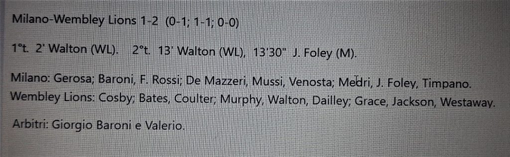 Il giorno seguente, con i Wembley Lions, nonostante una buonissima prestazione i nostri cedono per 2-0. Entrambe le reti vengono realizzate nel primo tempo, al nono minuto da Jackson e a un minuto dalla prima pausa da Walton. I giornali promuovono ancora a pieni voti Augusto Gerosa e Franco Rossi, segnalano l’inconsistenza dei reparti offensivi, ma va ricordato che negli ultimi due anni il Milano ha perso le sue bocche da fuoco, Gianni Scotti e Ignazio Dionisi, che hanno scelto di cambiare casacca e passare ai Diavoli Rossoneri. Si è giocato davanti a 5.000 spettatori.