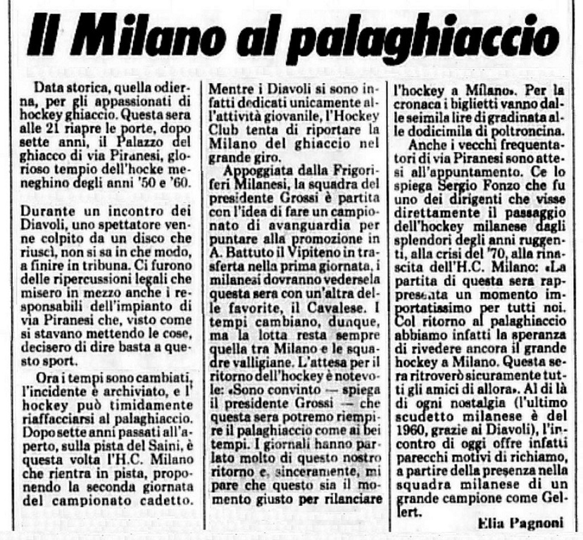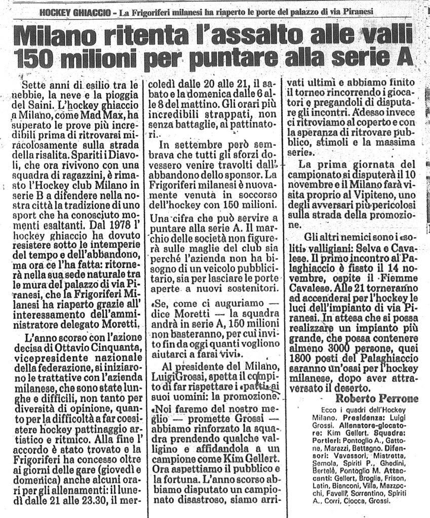 Frigoriferi Milanesi riabbraccia l’hockey. Decisivo un incontro tra Luigi Grossi e il proprietario del Palazzo Giuseppe Cabassi. Il trait d’union con l’HC Milano è l’AD Massimo Moretti, genero di Giuseppe Cabassi. Milaninter HC Argo ultima squadra a giocare un intero campionato in via Piranesi: serie B 1979/80. Primo acquisto Kim Gellert, già a Milano nel 1978/79 con la maglia dei Diavoli; ingaggiato con il doppio incarico di allenatore/giocatore.
