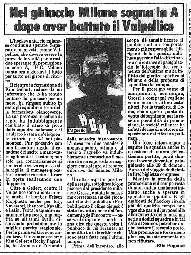 | 6 febbraio 1986: Milano-Valpellice 8-1 (1-0; 4-0; 3-1) |