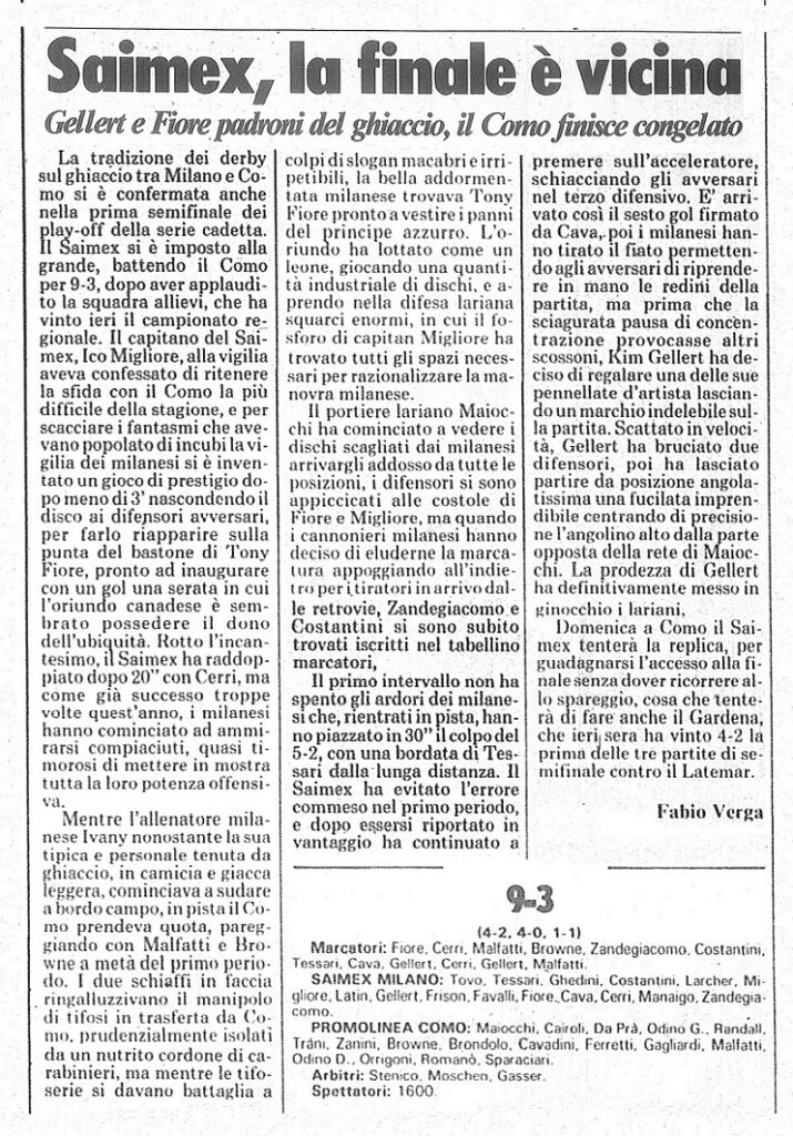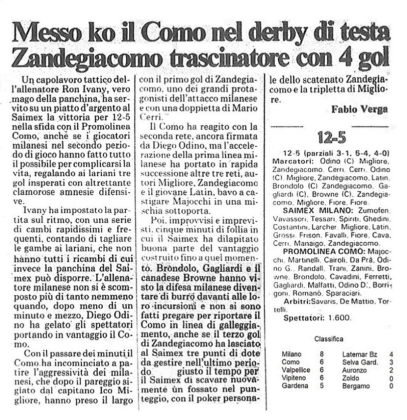 Inaspettata battuta d’arresto. Il Como, due sconfitte in tre partite, era per di più privo di due difensori titolari (Maurizio Zanini e Antonio Da Prà), ciononostante la macchina da gol milanese non è riuscita a sfondare. Al Piranesi arriva il Gardena.