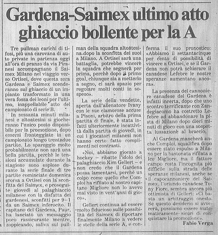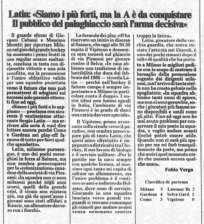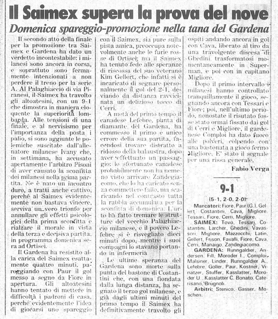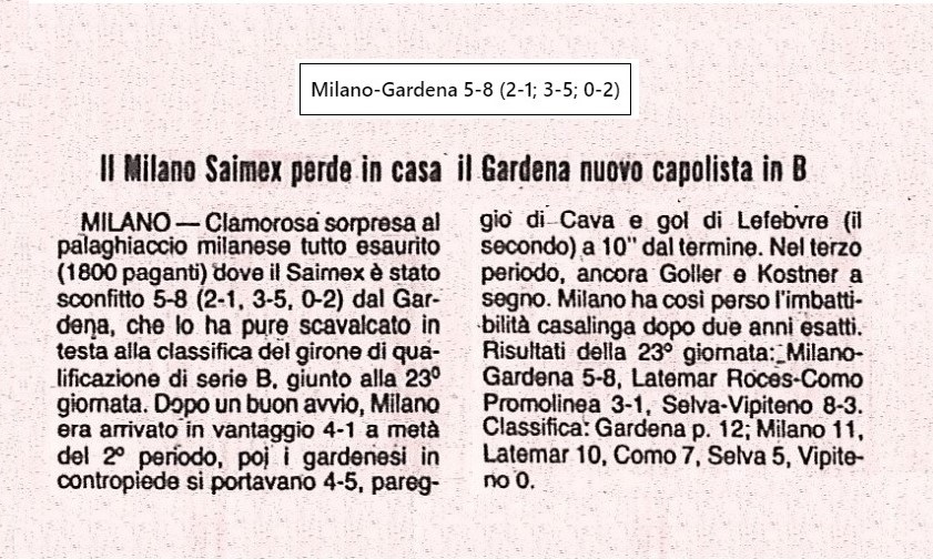 Un Gardena in gran forma sbanca il Piranesi. L’ultima squadra a espugnare il Palazzo era stato il Renon, impostosi per 4-3 il 13 febbraio 1986. Il Milano, da lepre a inseguitore, per tornare in testa deve vincerle tutte. A partire da Vipiteno Ron Ivany, decisione sorprendente, decide di sostituire Roberto Zumofen con Andrea Tovo. Fino alla fine del campionato sarà il giovane torinese a difendere la gabbia milanese.