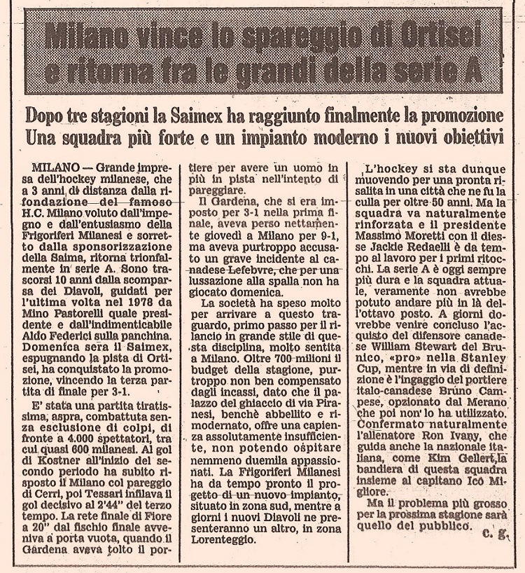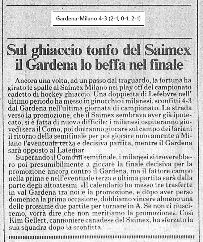 | 6 marzo 1988: Gardena-Milano 1-3 (0-0; 1-1; 0-2) |